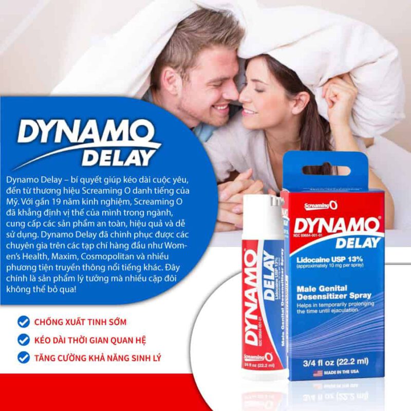 Dynamo Delay là dòng sản phẩm có xuất xứ từ USA với tác động tích cực giúp kéo dài thời gian quan hệ, giúp nam giới kiểm soát tình trạng xuất tinh sớm của bản thân. Sản phẩm là dạng xịt gây tê rất tiện dụng và có thể mang đi đến bất cứ đâu, Dynamo Delay sẽ là giải pháp giúp phái mạnh luôn ở “cửa trên” khi đối diện với người phụ nữ mà mình yêu thương.